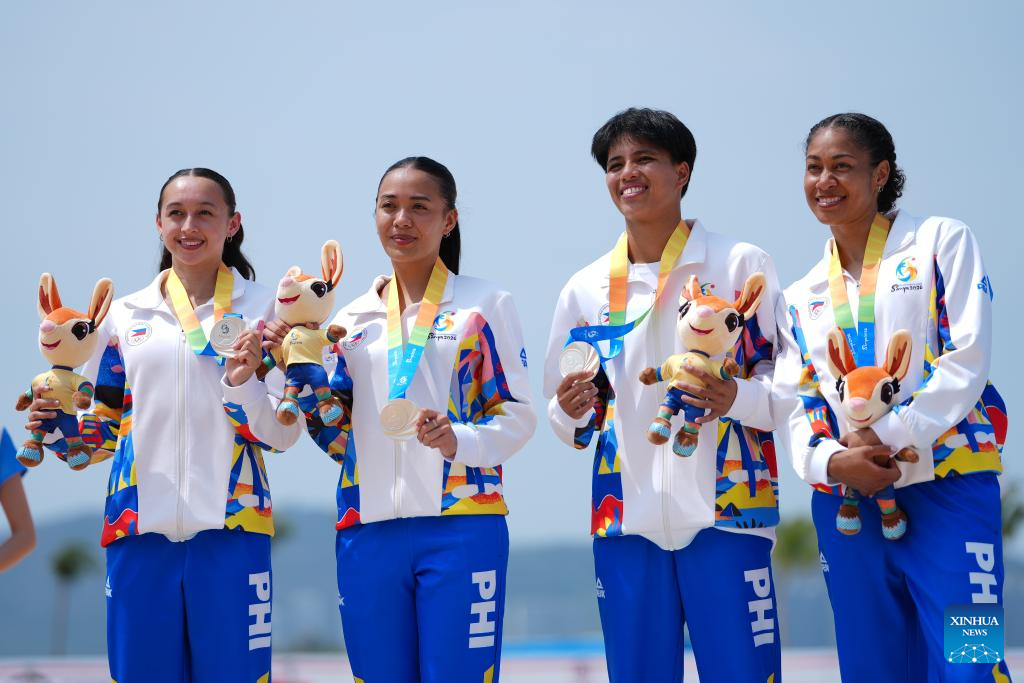 Silver medalist team the Philippines poses during the awarding ceremony of the women's 4x60m relay of beach athletics at the 6th Asian Beach Games in Sanya, south China's Hainan Province, April 26, 2026. (Xinhua/Pan Yulong)