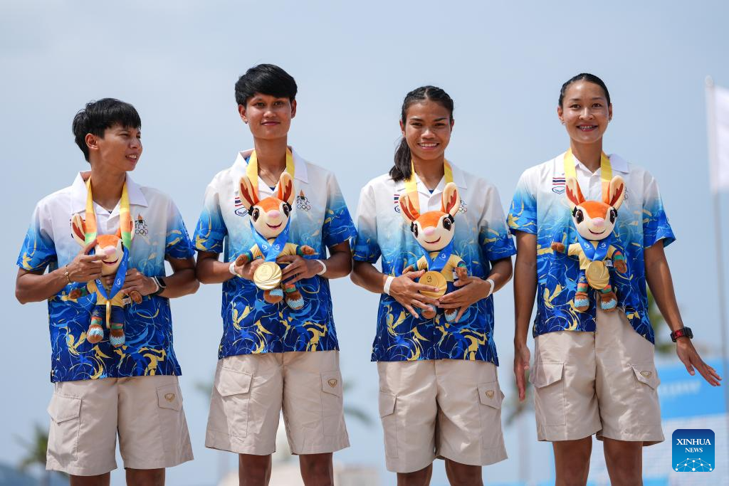 Gold medalist team Thailand poses during the awarding ceremony of the women's 4x60m relay of beach athletics at the 6th Asian Beach Games in Sanya, south China's Hainan Province, April 26, 2026. (Xinhua/Pan Yulong)