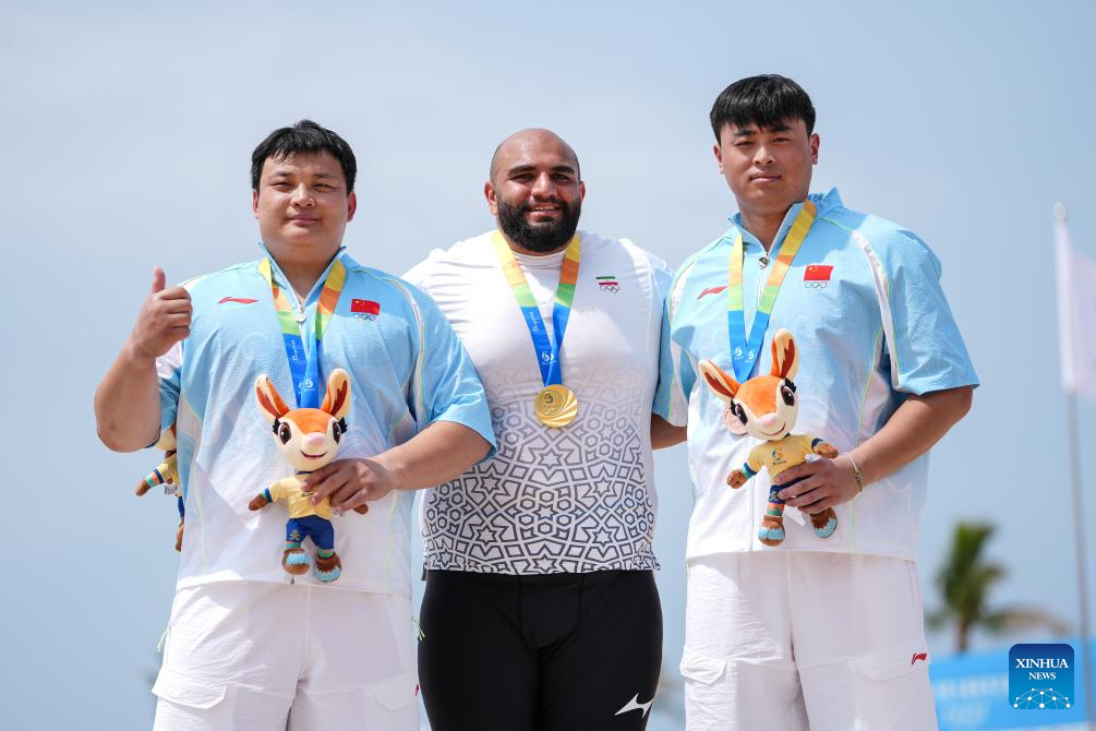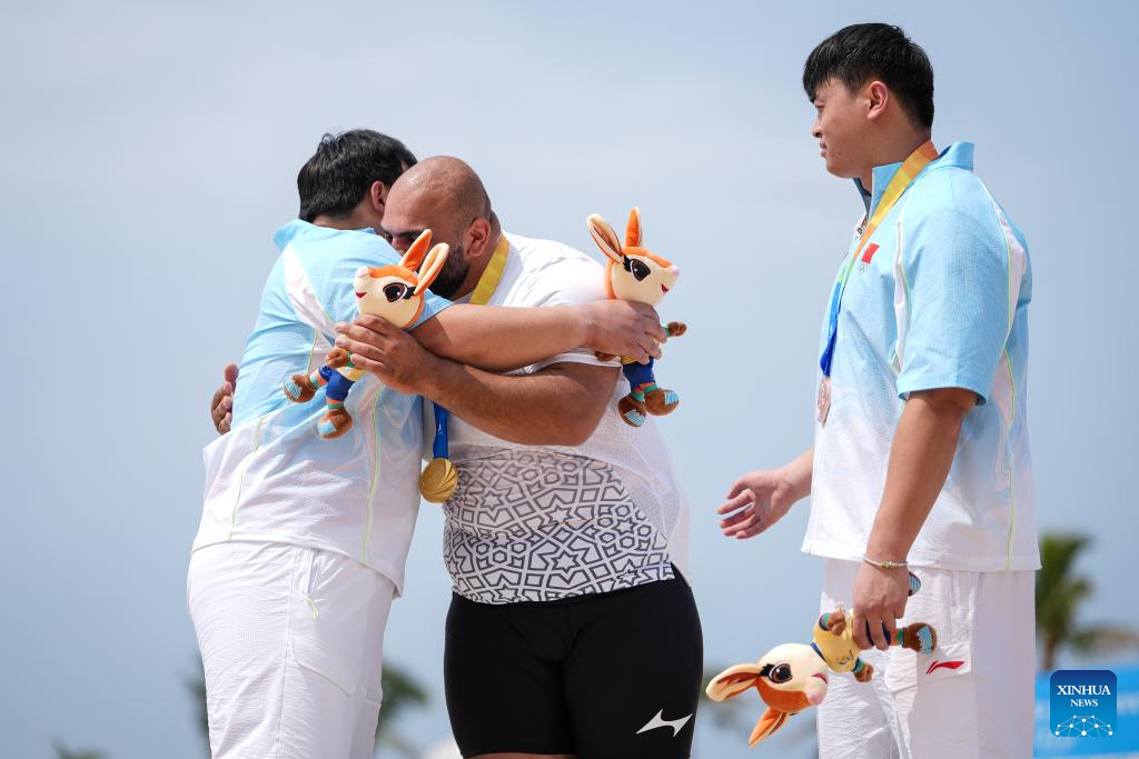 Gold medalist Hassan Ajamibakhtiarvand (C) of Iran greets with silver medalist Chen chengyu (L) of China during during the awarding ceremony of the men's shot put of beach athletics at the 6th Asian Beach Games in Sanya, south China's Hainan Province, April 26, 2026. (Xinhua/Pan Yulong)