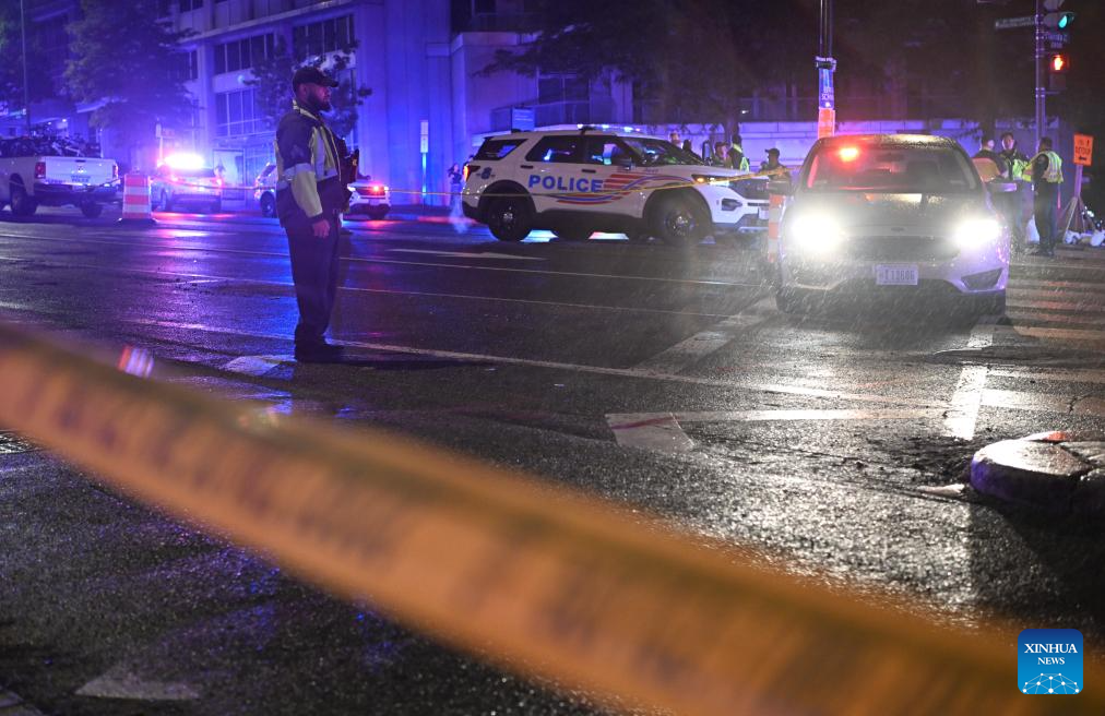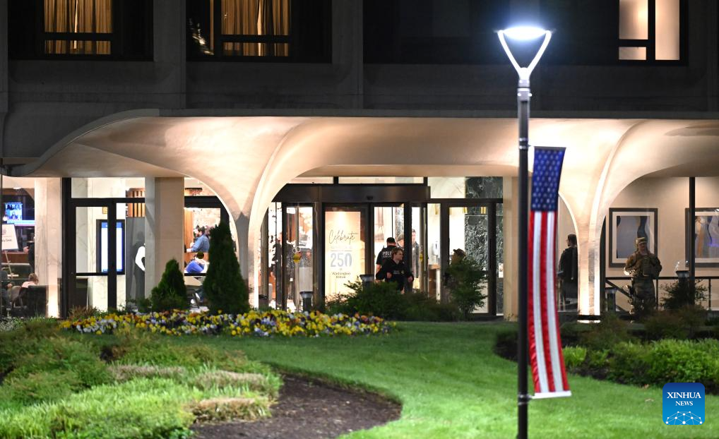 Police officers stand guard near the Washington Hilton Hotel, where the White House Correspondents' Dinner was held, in Washington, D.C., the United States, April 25, 2026. In a joint press conference, Washington, D.C. Mayor Muriel Bowser said all guests at the dinner were safe, while U.S. Attorney for D.C. Jeanine Pirro said the suspect now faces charges including using a firearm during a crime of violence and assault on a federal officer with a dangerous weapon.