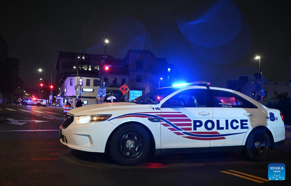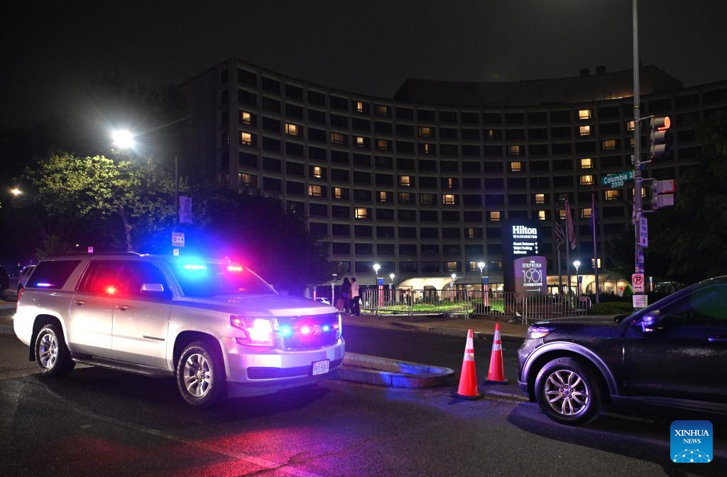 Police cars are seen near the Washington Hilton Hotel, where the White House Correspondents' Dinner was held, in Washington, D.C., the United States, April 25, 2026. In a joint press conference, Washington, D.C. Mayor Muriel Bowser said all guests at the dinner were safe, while U.S. Attorney for D.C. Jeanine Pirro said the suspect now faces charges including using a firearm during a crime of violence and assault on a federal officer with a dangerous weapon.