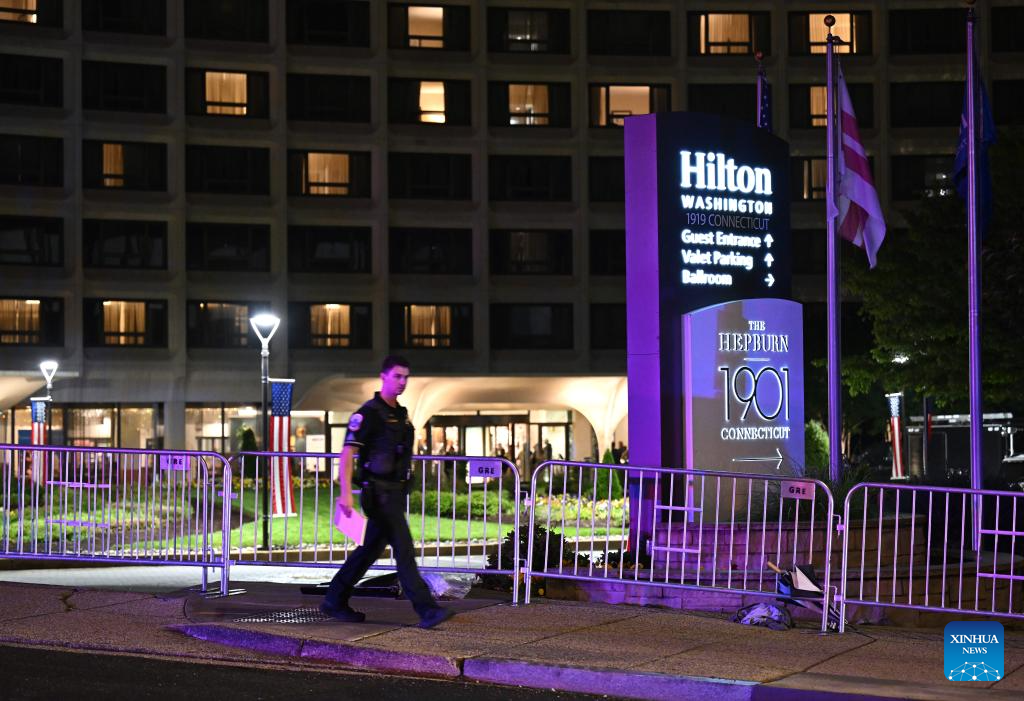 A police officer walks near the Washington Hilton Hotel, where the White House Correspondents' Dinner was held, in Washington, D.C., the United States, April 25, 2026. In a joint press conference, Washington, D.C. Mayor Muriel Bowser said all guests at the dinner were safe, while U.S. Attorney for D.C. Jeanine Pirro said the suspect now faces charges including using a firearm during a crime of violence and assault on a federal officer with a dangerous weapon.