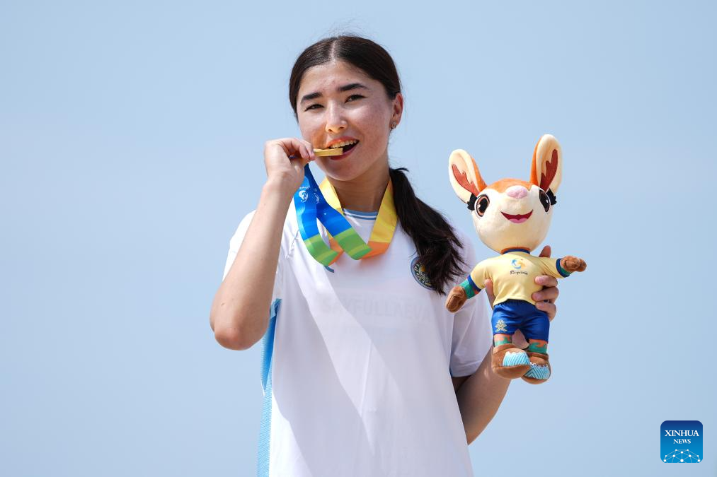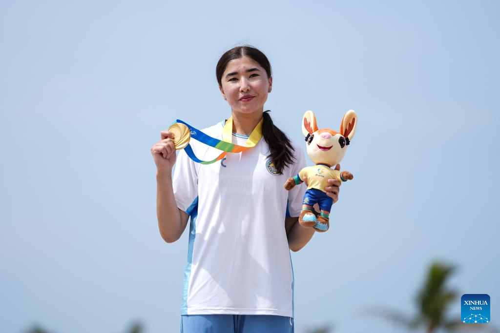 Gold medalist Barnokhon Sayfullaeva of Uzbekistan poses for photos during the awarding ceremony of the women's high jump of beach athletics at the 6th Asian Beach Games in Sanya, south China's Hainan Province, April 26, 2026. (Xinhua/Pan Yulong)
