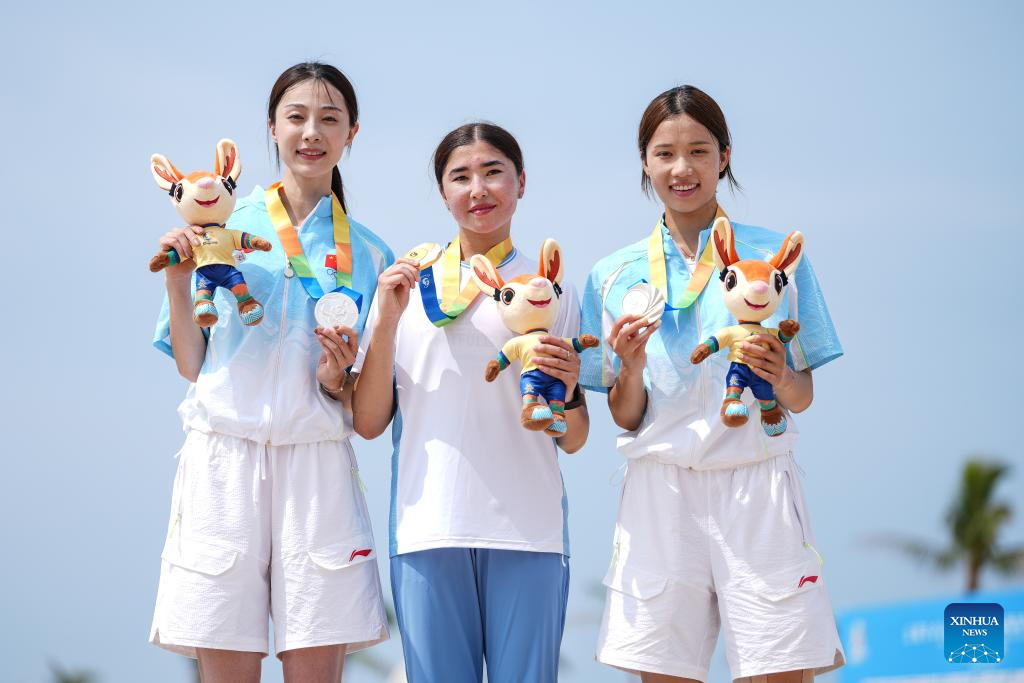 Gold medalist Barnokhon Sayfullaeva (C) of Uzbekistan, silver medalists Hu Linpeng (L) and Shao Yuqi of China pose for photos during the awarding ceremony of the women's high jump of beach athletics at the 6th Asian Beach Games in Sanya, south China's Hainan Province, April 26, 2026. (Xinhua/Pan Yulong)