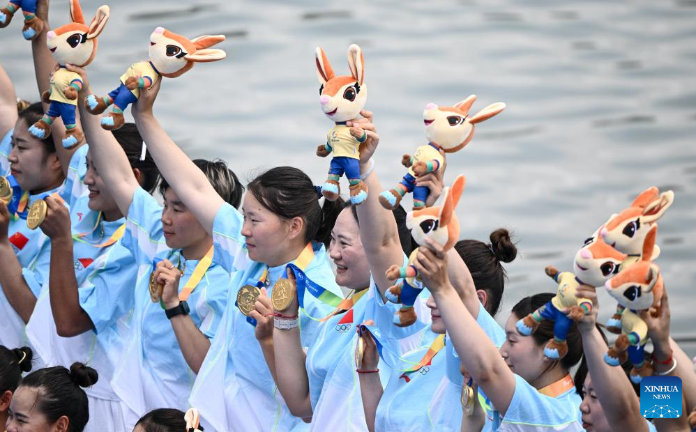 Team China (bottom) celebrates after the grand final of small boat women's 400m straight race of dragon boat event at the 6th Asian Beach Games in Sanya, south China's Hainan Province, April 26, 2026 (Xinhua/Yang Guanyu)