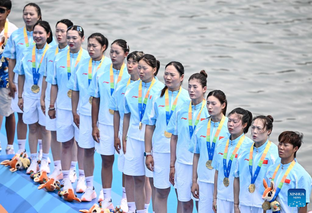 Gold medalist team China reacts during the awarding ceremony of small boat women's 400m straight race of dragon boat event at the 6th Asian Beach Games in Sanya, south China's Hainan Province, April 26, 2026 (Xinhua/Yang Guanyu)