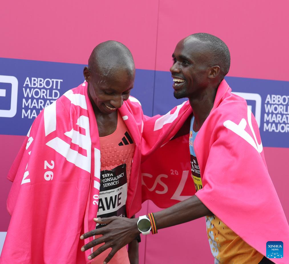 Sebastian Sawe (R) of Kenya reacts after the men's elite race at the London Marathon in London, Britain, April 26, 2026. (Xinhua/Li Ying)
