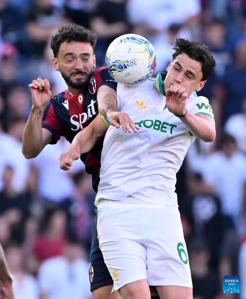 Roma's Nicolo Pisilli (R) vies with Bologna's Joao Mario during a Serie A football match between Roma and Bologna in Bologna, Italy, April 25, 2026. (Photo by Alberto Lingria/Xinhua)