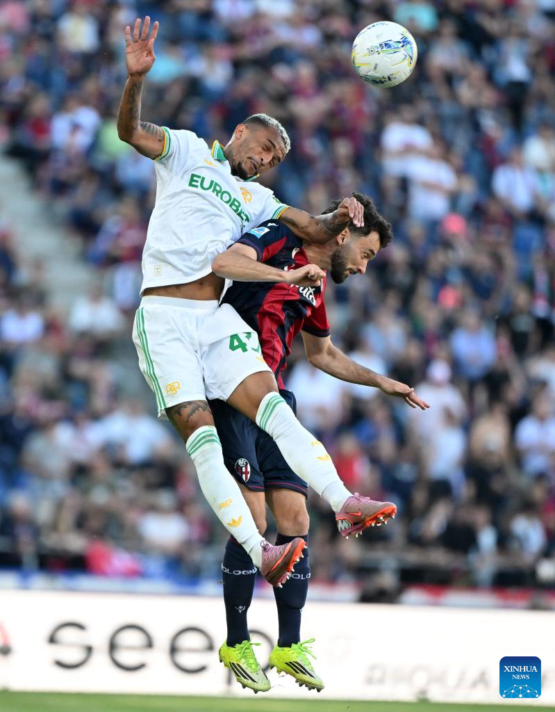 Roma's Wesley Vinicius Franca Lima (L) vies with Bologna's Joao Mario during a Serie A football match between Roma and Bologna in Bologna, Italy, April 25, 2026. (Photo by Alberto Lingria/Xinhua)