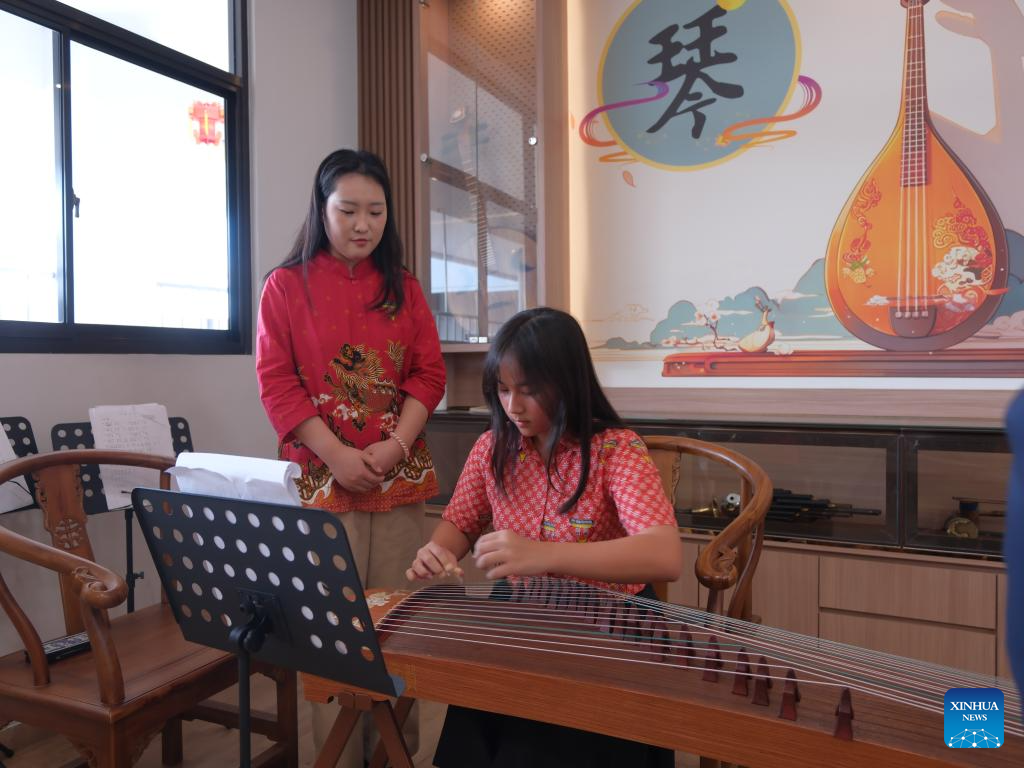 A student (R) learns to play the Guzheng, a traditional Chinese musical instrument, at the Confucius Classroom of Puhua Trilingual School in Purwokerto, Central Java Province, Indonesia, April 25, 2026. (Xinhua/Li Fuyu)