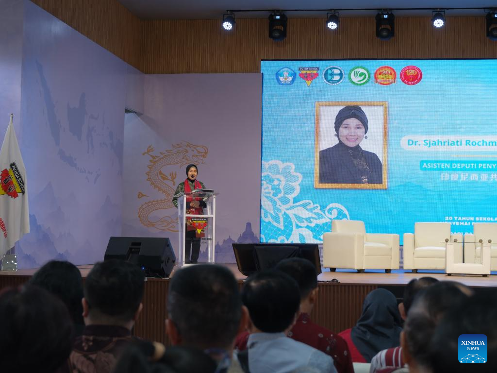 Sjahriati Rochmah, assistant to Indonesia's Cabinet Secretariat, addresses a forum on Chinese-language education at Puhua Trilingual School in Purwokerto, Central Java Province, Indonesia, April 25, 2026. (Xinhua/Li Fuyu)