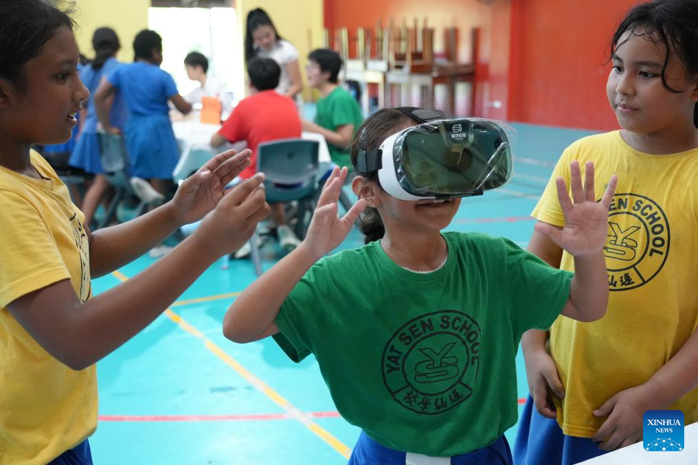 A student wears an AR device to experience Chinese 24 Solar Terms during a celebration to mark the International Chinese Language Day in Suva, Fiji, April 24, 2026. Teachers and students of a Fijian school have celebrated the International Chinese Language Day in Suva, highlighting the importance of cultural exchange and mutual respect. (Photo by Gao Xin/Xinhua)
