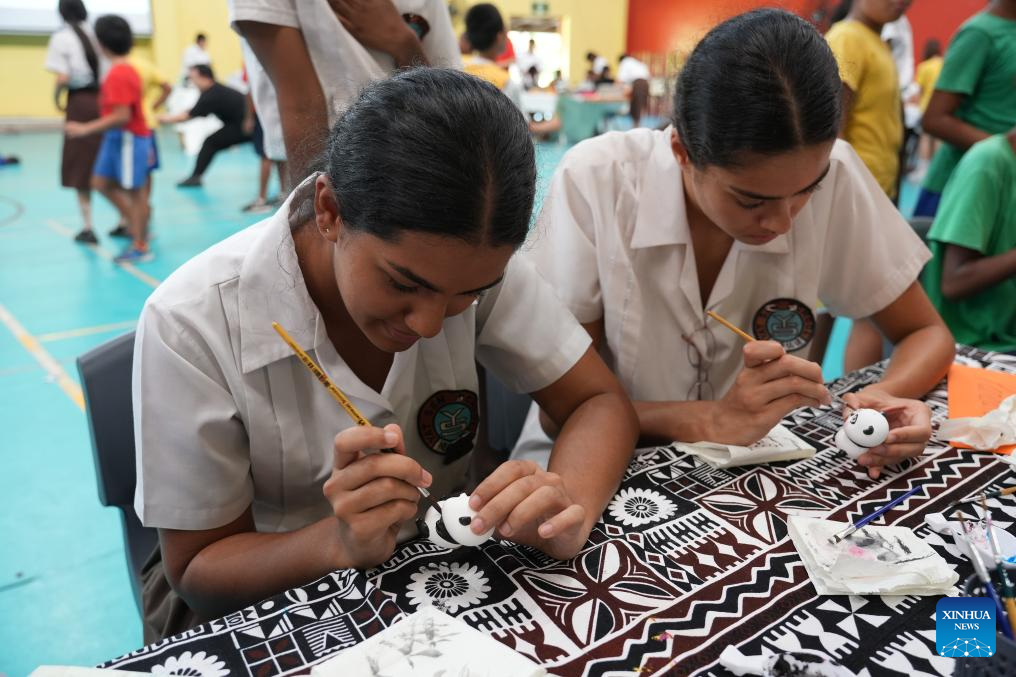 Students paint panda sculptures during a celebration to mark the International Chinese Language Day in Suva, Fiji, April 24, 2026. Teachers and students of a Fijian school have celebrated the International Chinese Language Day in Suva, highlighting the importance of cultural exchange and mutual respect. (Photo by Gao Xin/Xinhua)