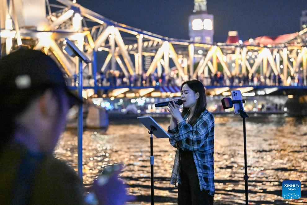 A singer performs at a waterfront platform by the Haihe River in Tianjin, north China, April 24, 2026. In recent years, Tianjin has become a popular tourist destination, as the city keeps enriching its nighttime experience by expanding tourism scenarios and diversifying business formats. (Xinhua/Sun Fanyue)
