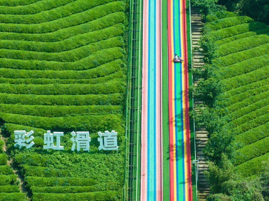 An aerial drone photo taken on April 26, 2026 shows a tourist enjoying a slide in Xiaogucheng Village of Jingshan Town in Yuhang District of Hangzhou City, east China's Zhejiang Province. (Xinhua/Jiang Han)