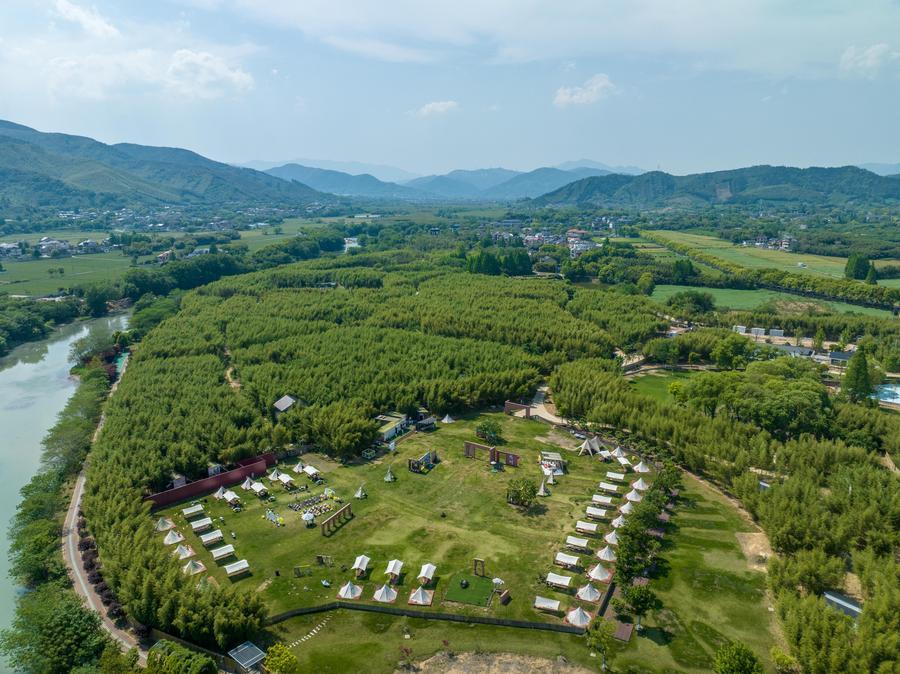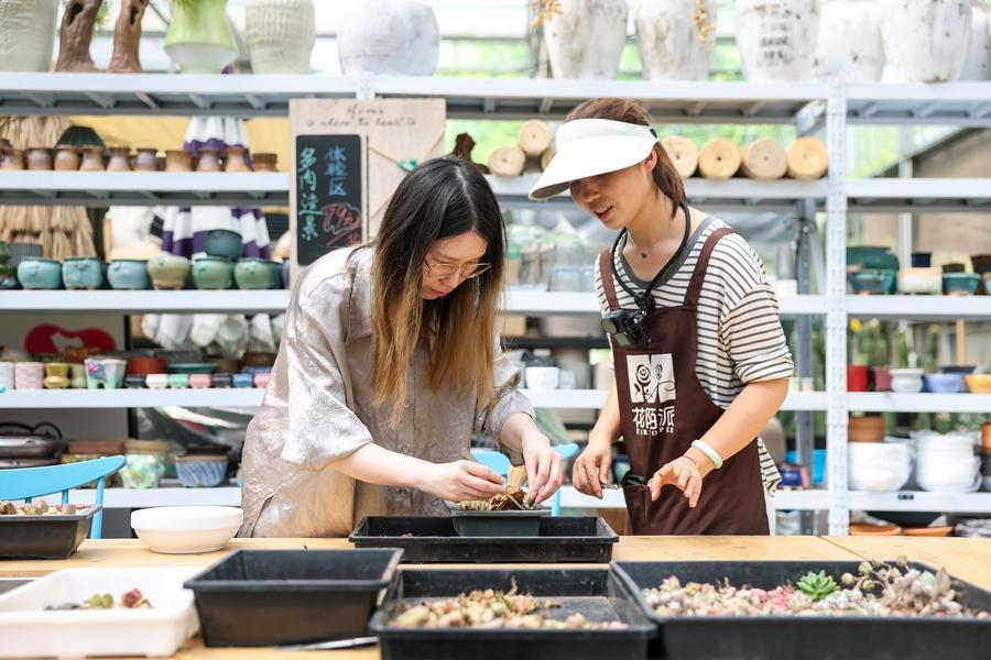 An aerial drone photo taken on April 26, 2026 shows a camping site in Xiaogucheng Village of Jingshan Town in Yuhang District of Hangzhou City, east China's Zhejiang Province. (Xinhua/Jiang Han)A staff member (R) guides a tourist in landscaping with succulent plants at a planting base in Yanshan Village of Shangcheng District of Hangzhou City, east China's Zhejiang Province, April 25, 2026. (Xinhua/Jiang Han)