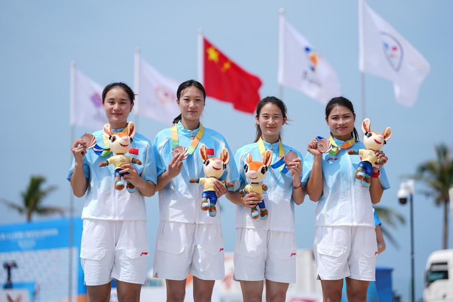 SANYA, April 26 (Xinhua) -- China took four gold medals in beach athletics, open water swimming and dragon boat racing at the ongoing Asian Beach Games here on Sunday.