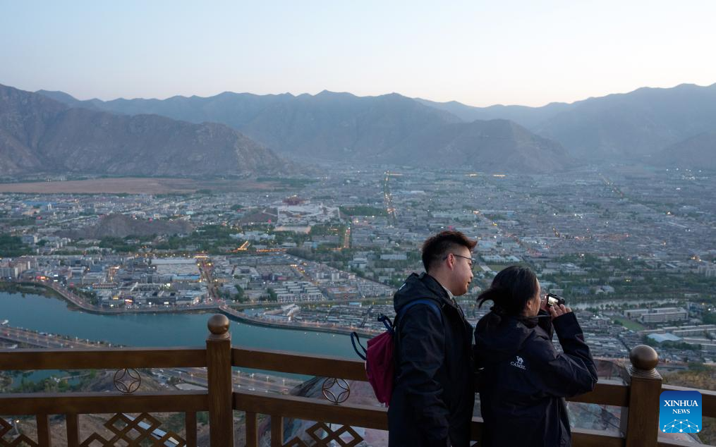 Tourists take photos at the Nanshan park in Lhasa, southwest China's Xizang Autonomous Region, April 26, 2026. (Xinhua/Tenzin Nyida)
