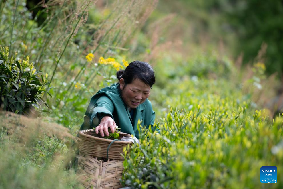 A picker picks tea leaves at a tea garden on the mountain in Houkeng Village, Huangshan District of Huangshan City, east China's Anhui Province, April 24, 2026. Taiping Houkui is a renowned green tea from Anhui, known for its flat, elongated leaves. It offers a unique aroma, mellow taste, and sweet aftertaste. Recently, the core production area of Taiping Houkui, the high-mountain tea gardens in Houkeng Village of Huangshan City, have entered the busiest harvest season.