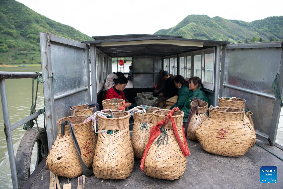 Pickers take a boat to return to Houkeng Village, Huangshan District of Huangshan City, east China's Anhui Province, April 24, 2026. Taiping Houkui is a renowned green tea from Anhui, known for its flat, elongated leaves. It offers a unique aroma, mellow taste, and sweet aftertaste. Recently, the core production area of Taiping Houkui, the high-mountain tea gardens in Houkeng Village of Huangshan City, have entered the busiest harvest season.