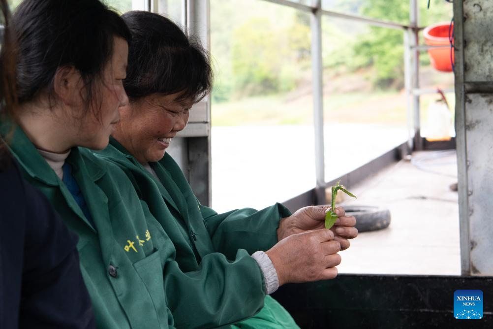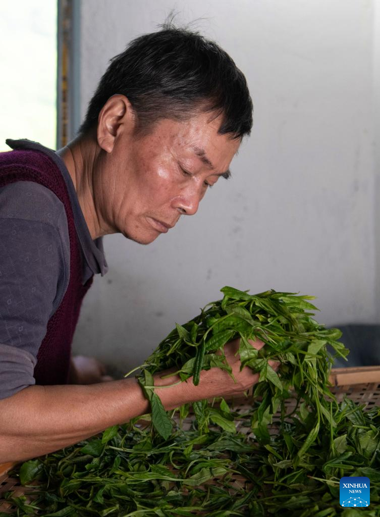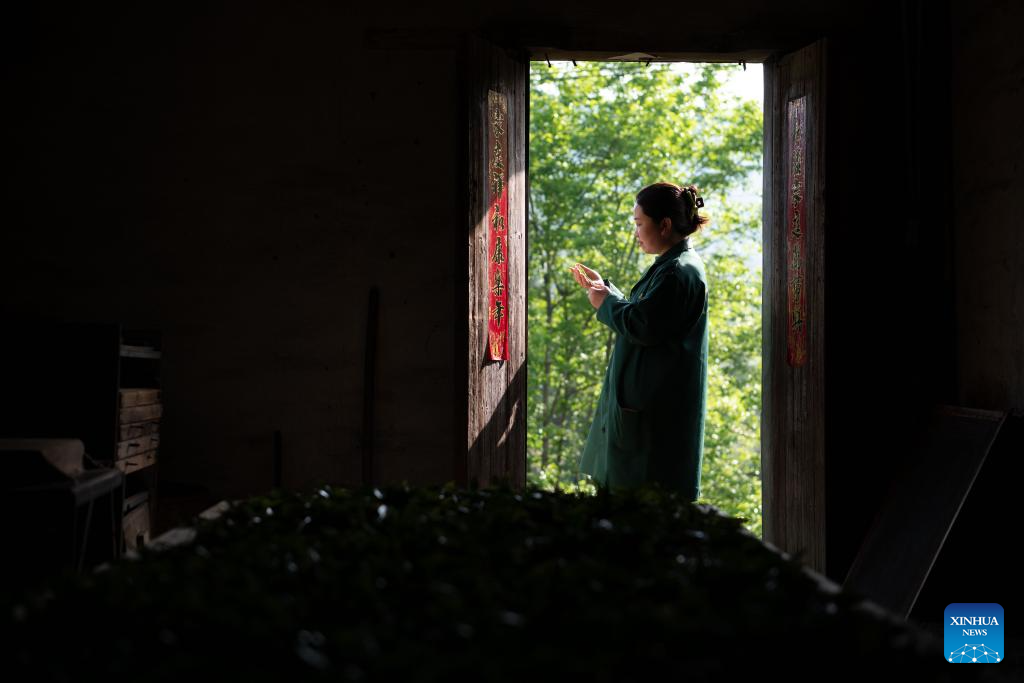 A tea farmer checks the tea leaves in Houkeng Village, Huangshan District of Huangshan City, east China's Anhui Province, April 25, 2026. Taiping Houkui is a renowned green tea from Anhui, known for its flat, elongated leaves. It offers a unique aroma, mellow taste, and sweet aftertaste. Recently, the core production area of Taiping Houkui, the high-mountain tea gardens in Houkeng Village of Huangshan City, have entered the busiest harvest season.