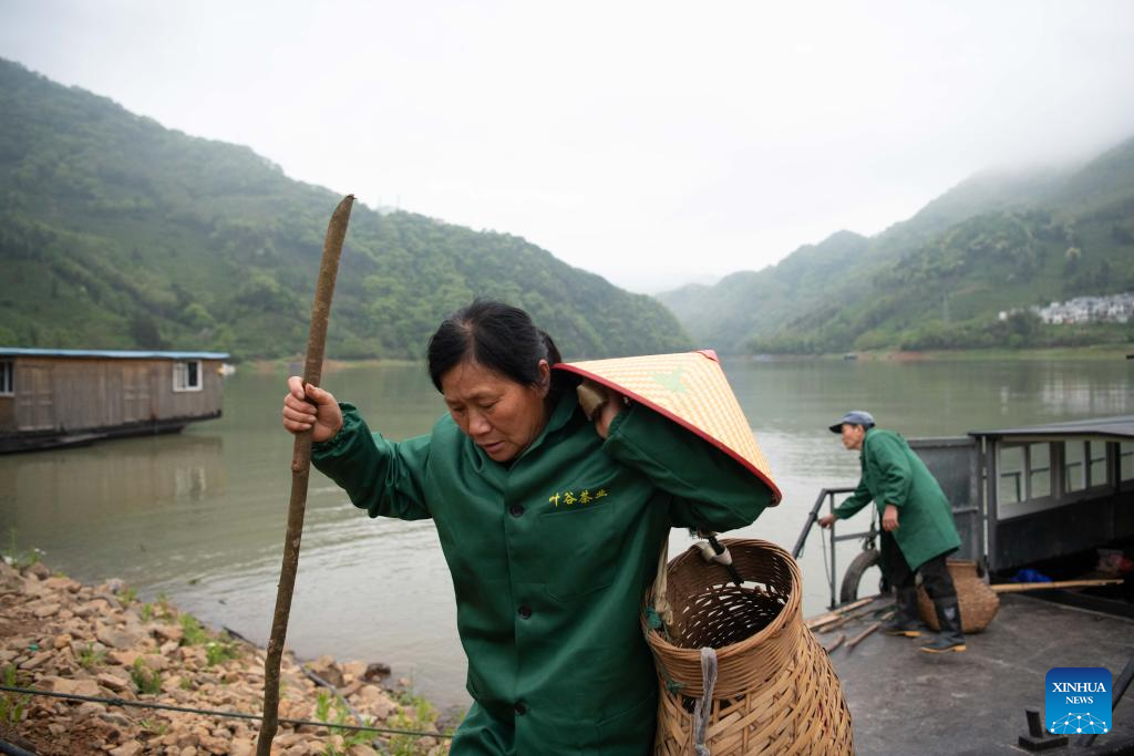Pickers transport freshly picked tea leaves to a boat in Houkeng Village, Huangshan District of Huangshan City, east China's Anhui Province, April 24, 2026. Taiping Houkui is a renowned green tea from Anhui, known for its flat, elongated leaves. It offers a unique aroma, mellow taste, and sweet aftertaste. Recently, the core production area of Taiping Houkui, the high-mountain tea gardens in Houkeng Village of Huangshan City, have entered the busiest harvest season.