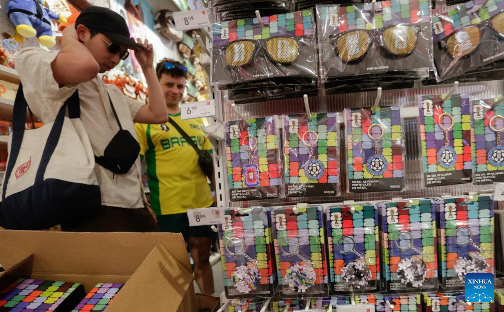 FIFA World Cup 2026 souvenirs are displayed for sale inside a shop in Vancouver, Canada, April 26, 2026. (Photo by Liang Sen/Xinhua)