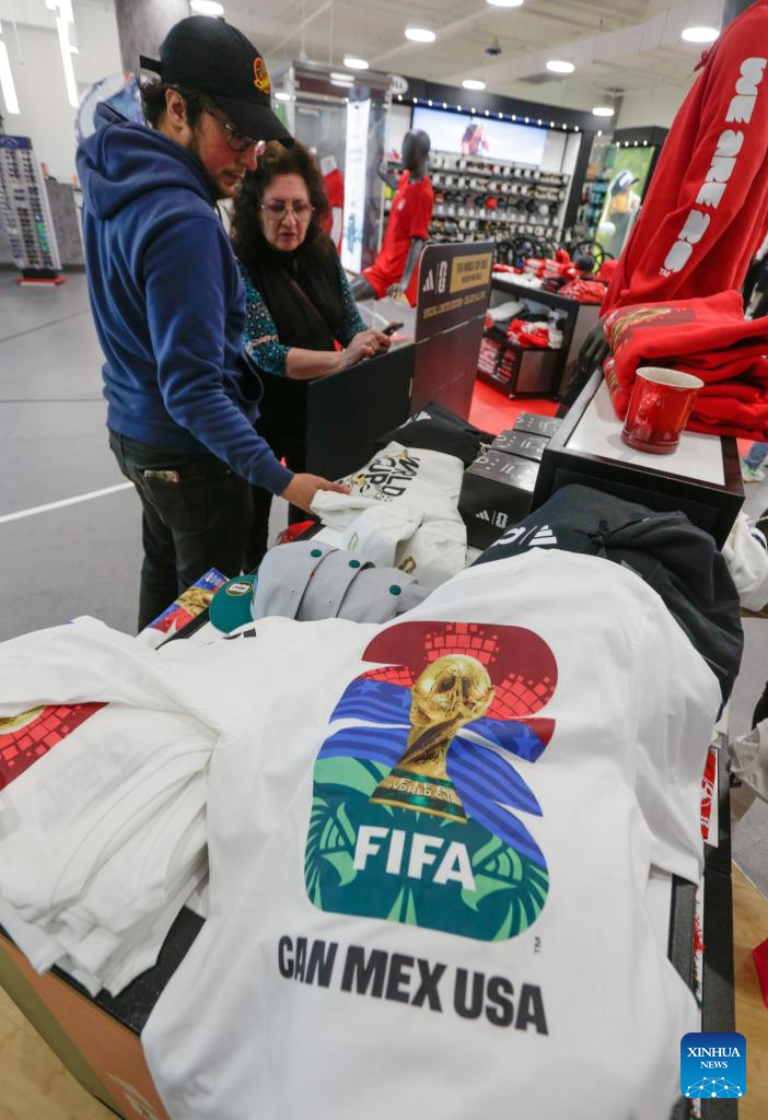 Customers look through 2026 FIFA World Cup apparel inside a shop in Vancouver, Canada, April 26, 2026. (Photo by Liang Sen/Xinhua)