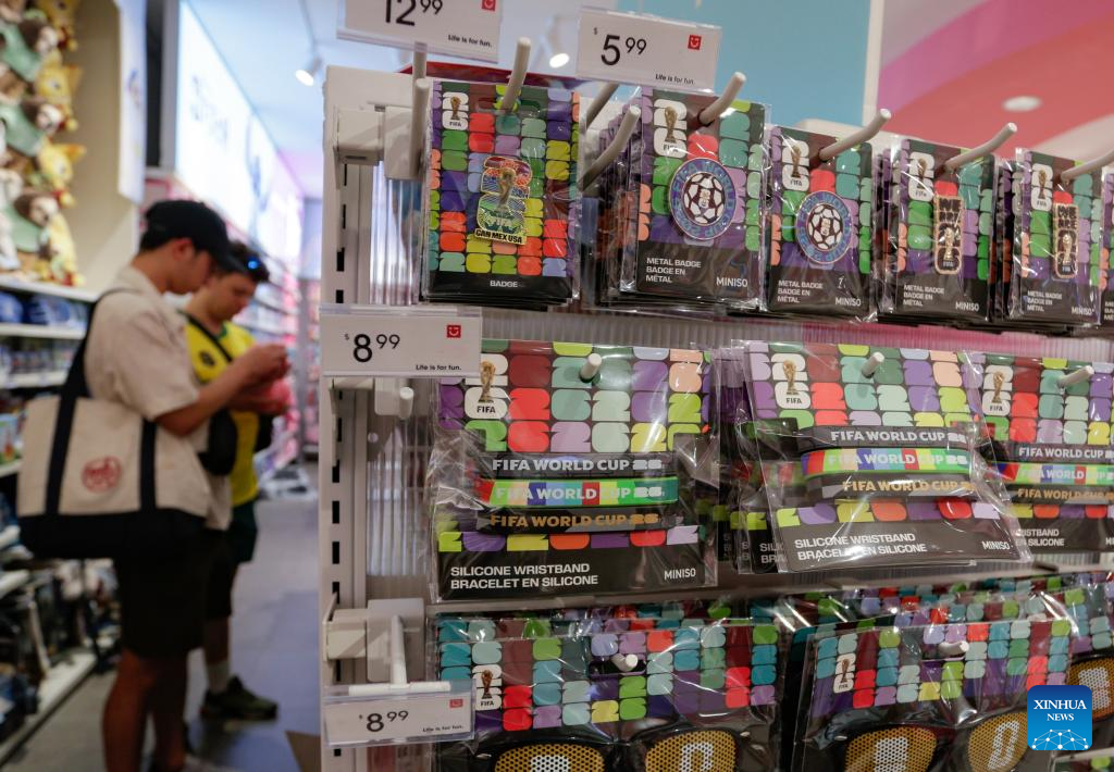 2026 FIFA World Cup-themed pins are pictured inside a shop in Vancouver, Canada, April 26, 2026. (Photo by Liang Sen/Xinhua)