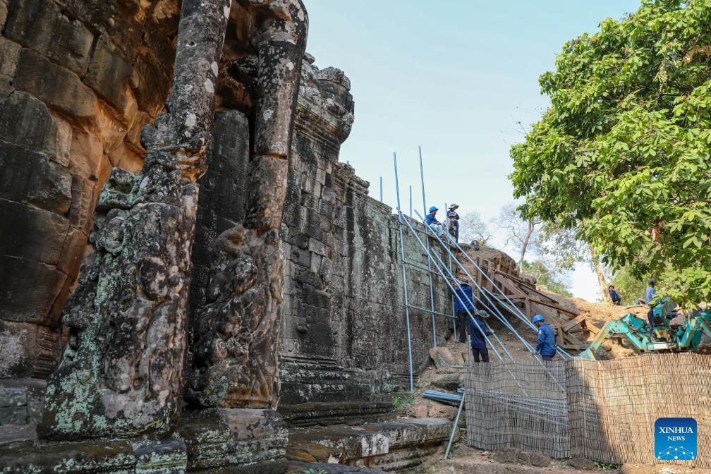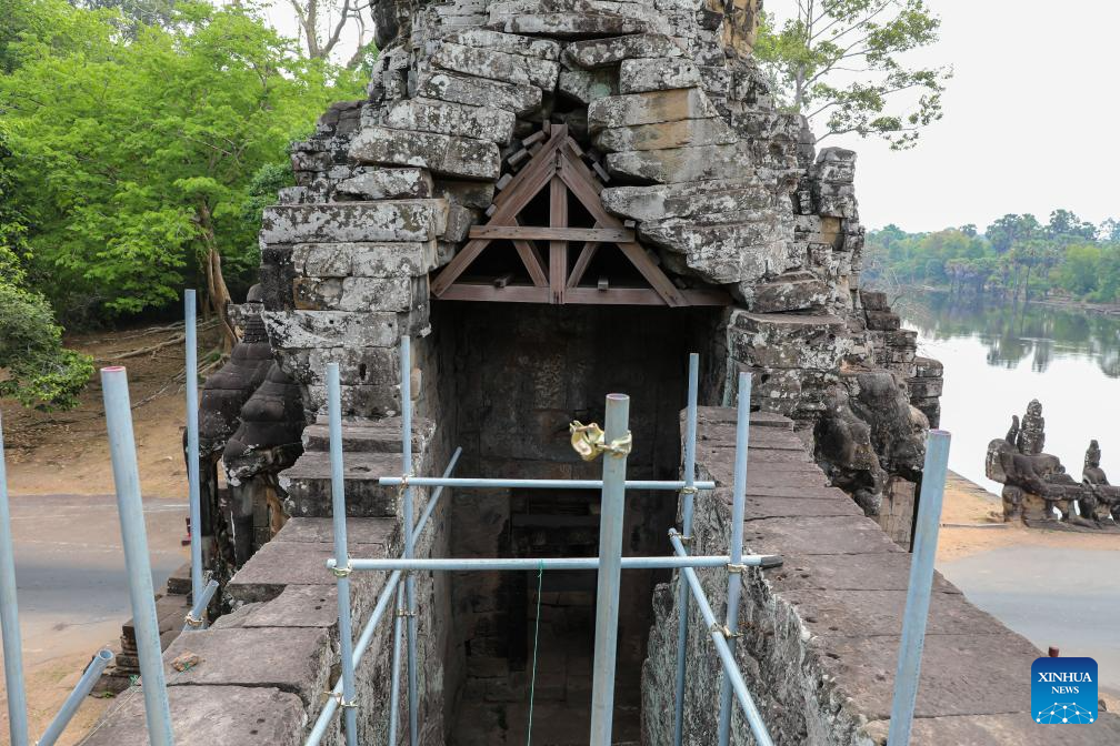 PHNOM PENH, April 27 (Xinhua) -- An archaeological team has been restoring the laterite wall of the centuries-old Angkor Thom in the UNESCO-listed Angkor Archaeological Park in northwest Cambodia's Siem Reap province, said a news release from the APSARA National Authority (ANA) on Monday.