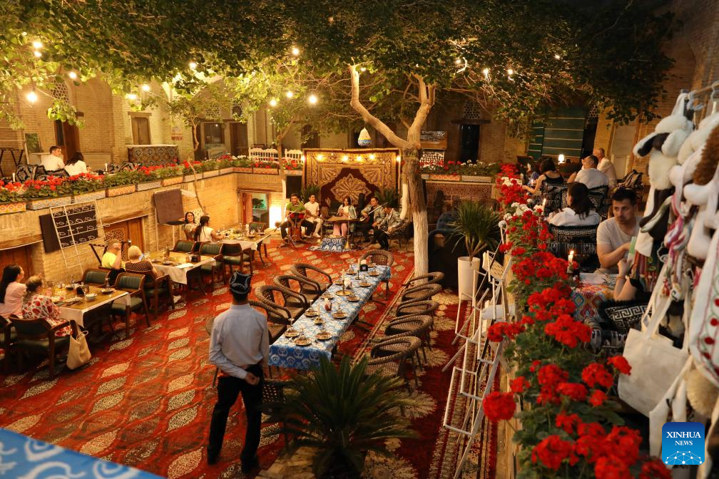 People have supper in the ancient city of Bukhara, Uzbekistan on April 25, 2026. (Xinhua/Li Renzi)
