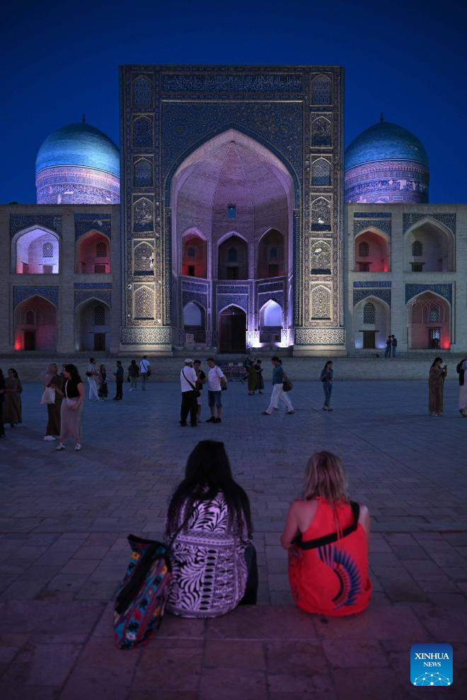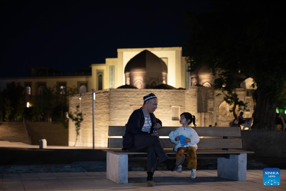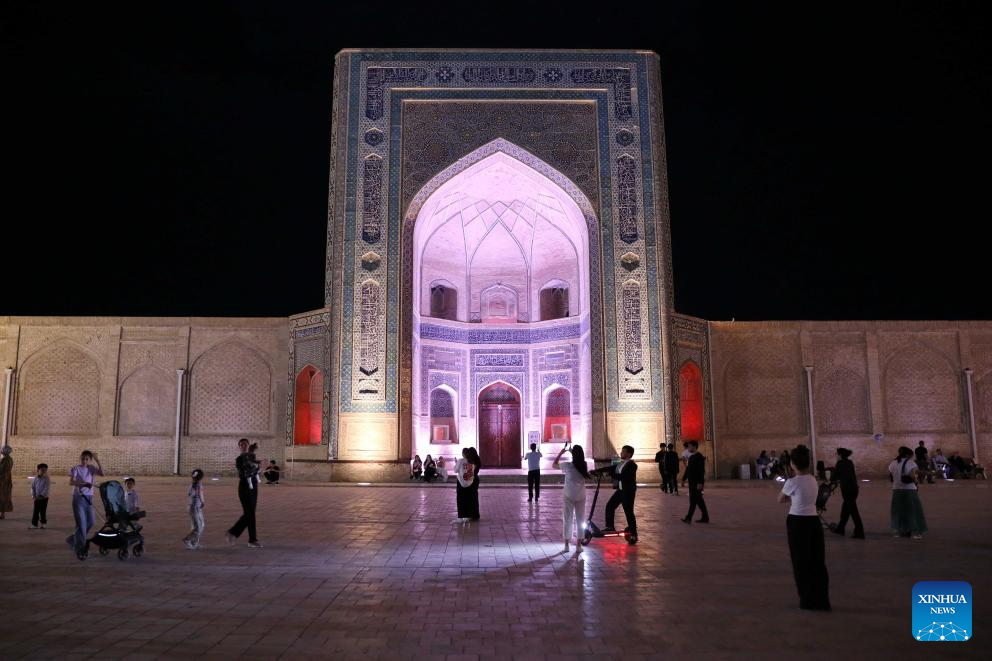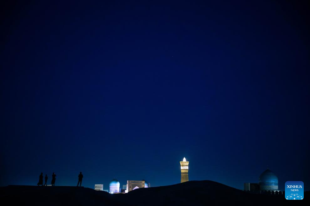 This photo taken on April 25, 2026 shows the night view of the ancient city of Bukhara, Uzbekistan. (Xinhua/Li Renzi)