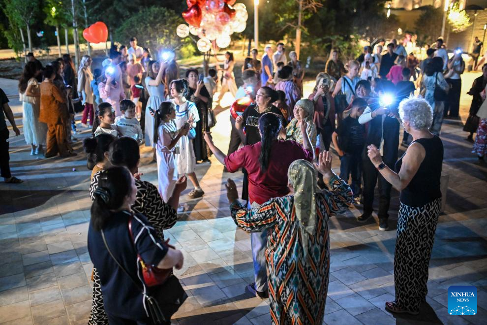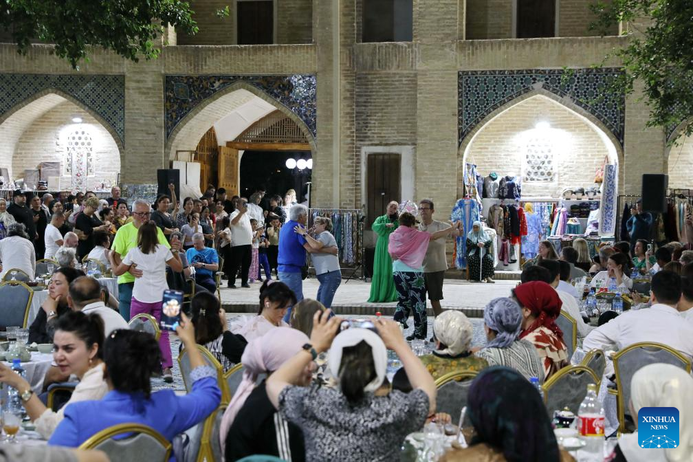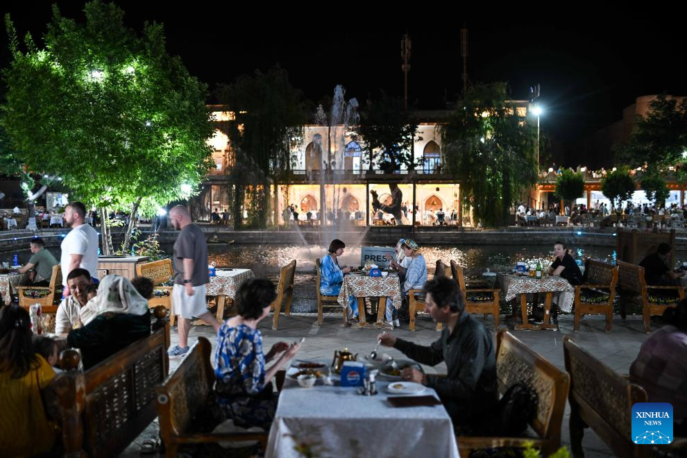 People have supper in the ancient city of Bukhara, Uzbekistan on April 25, 2026. (Photo by Zafar Khalilov/Xinhua)