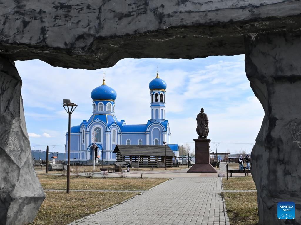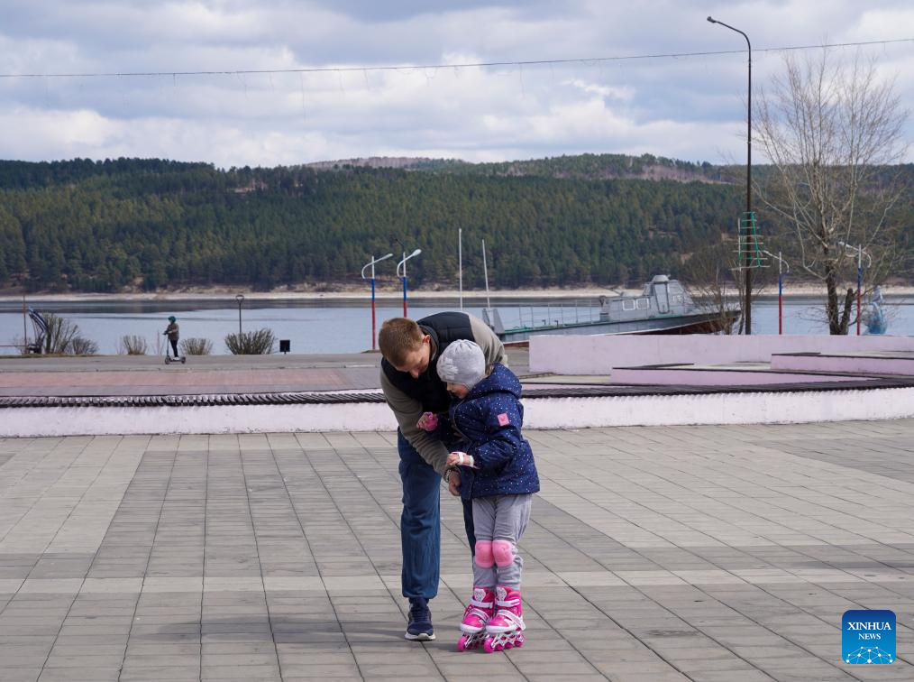 People have fun at the park on the bank of the Angara River in Svirsk, Russia, on April 26, 2026. (Xinhua/Liu Kai)