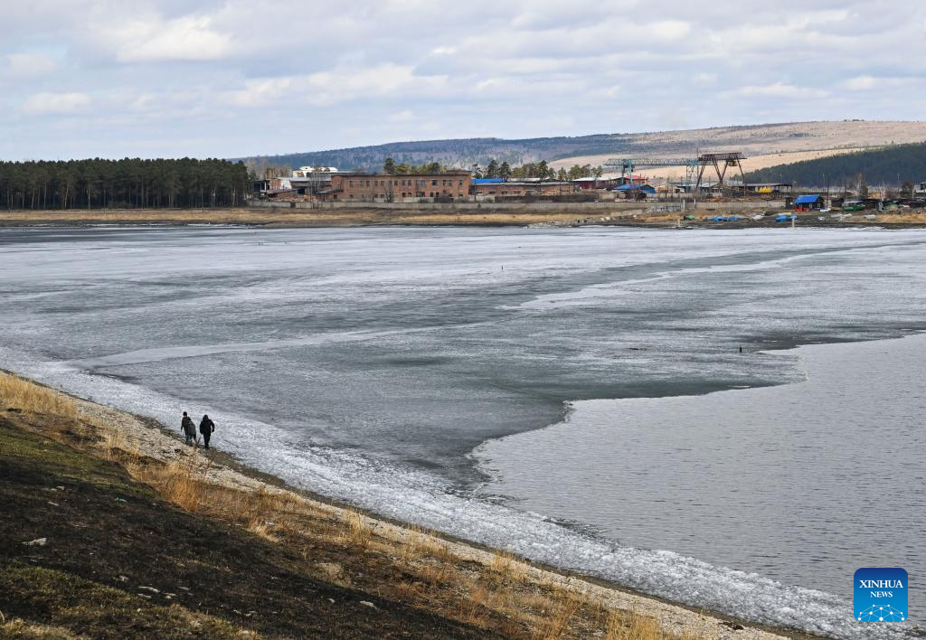 Children walk along the bank of the Angara River in Svirsk, Russia, on April 26, 2026. (Xinhua/Hao Jianwei)