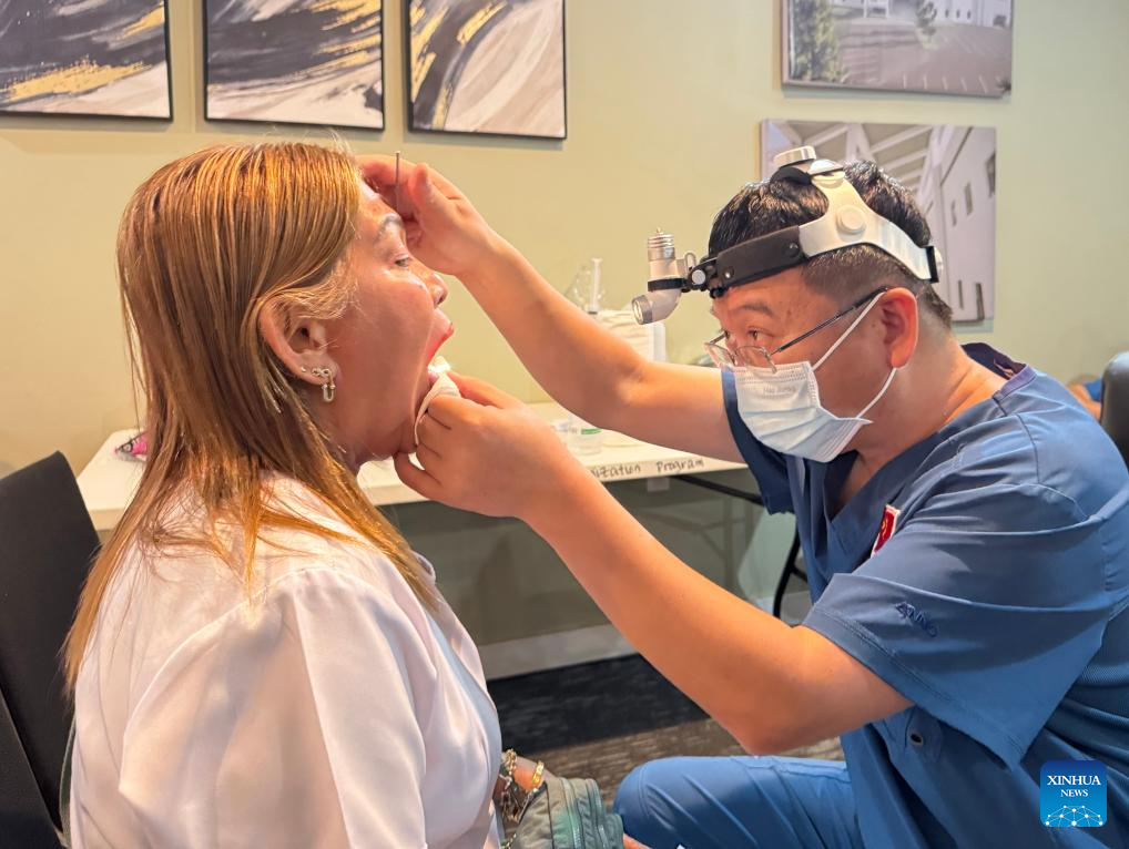 A doctor (C) from a Chinese medical team administers acupuncture therapy to a patient in Chuuk State, the Federated States of Micronesia, April 20, 2026. (Chinese medical team assisting the FSM/Handout via Xinhua)