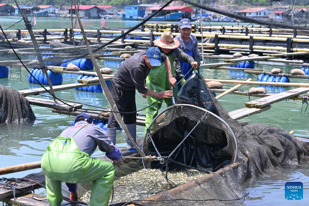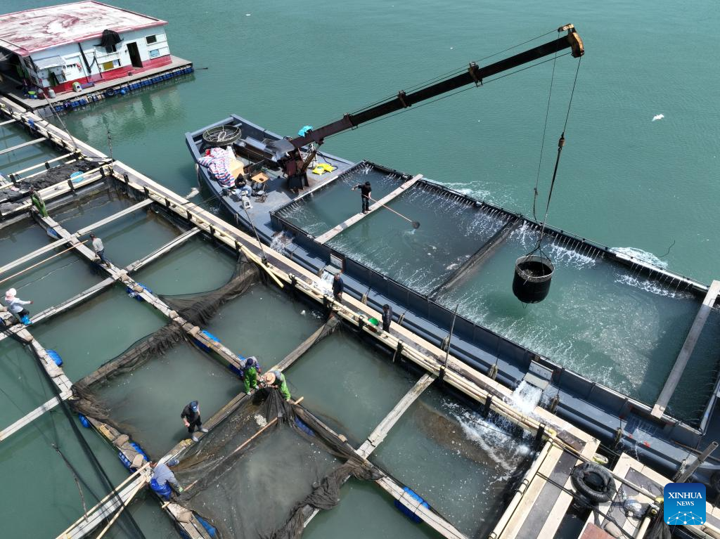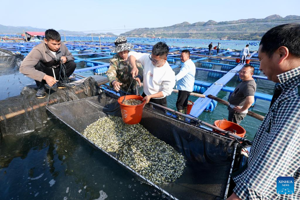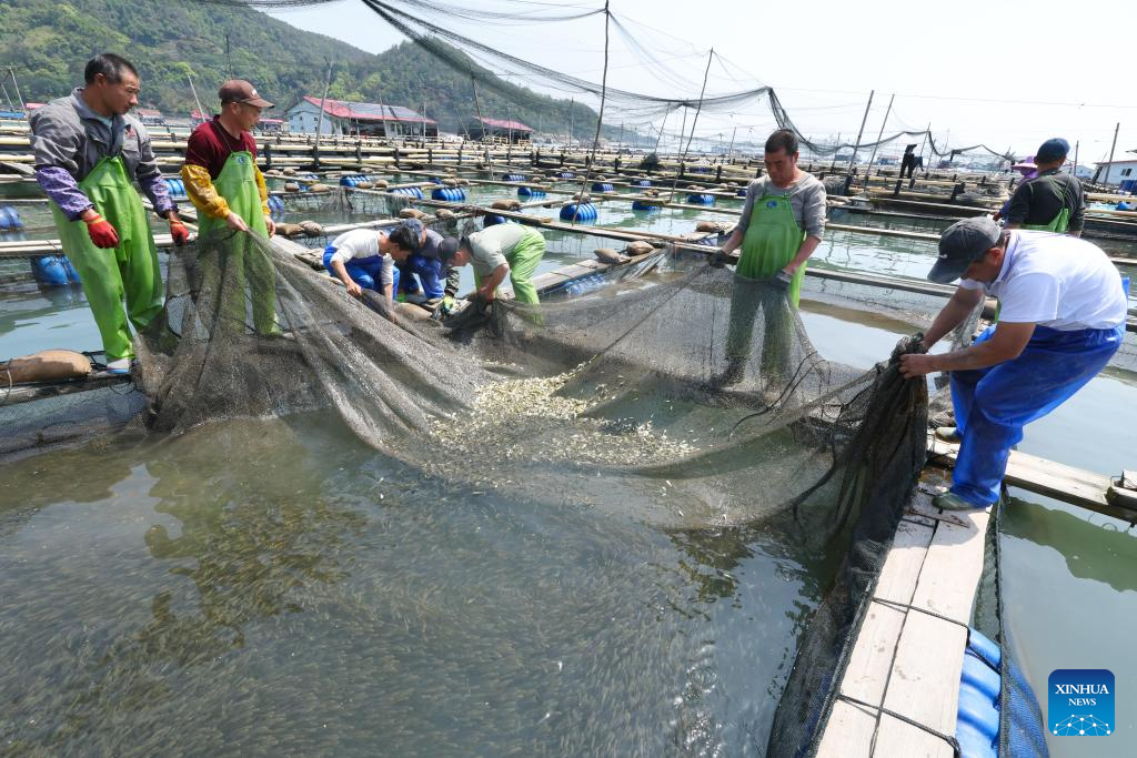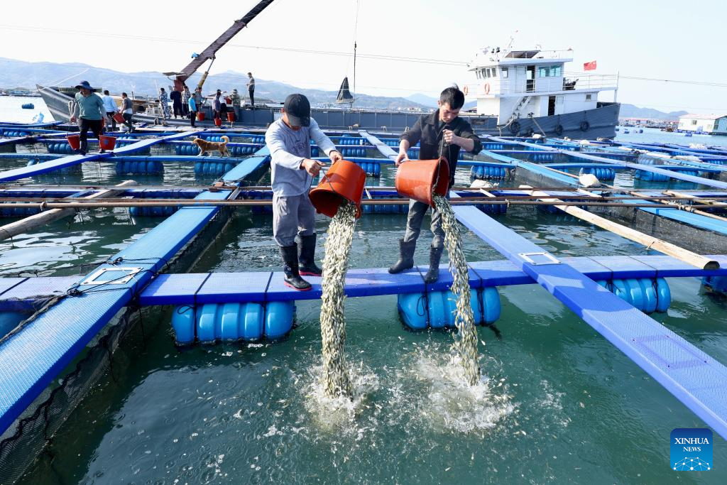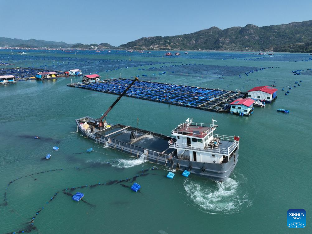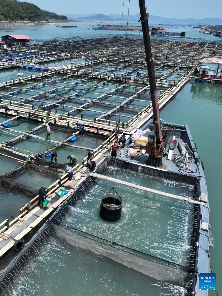 Workers collect large yellow croaker fries from fish farming platforms at a mariculture farm in Ningde, southeast China's Fujian Province, April 25, 2026.