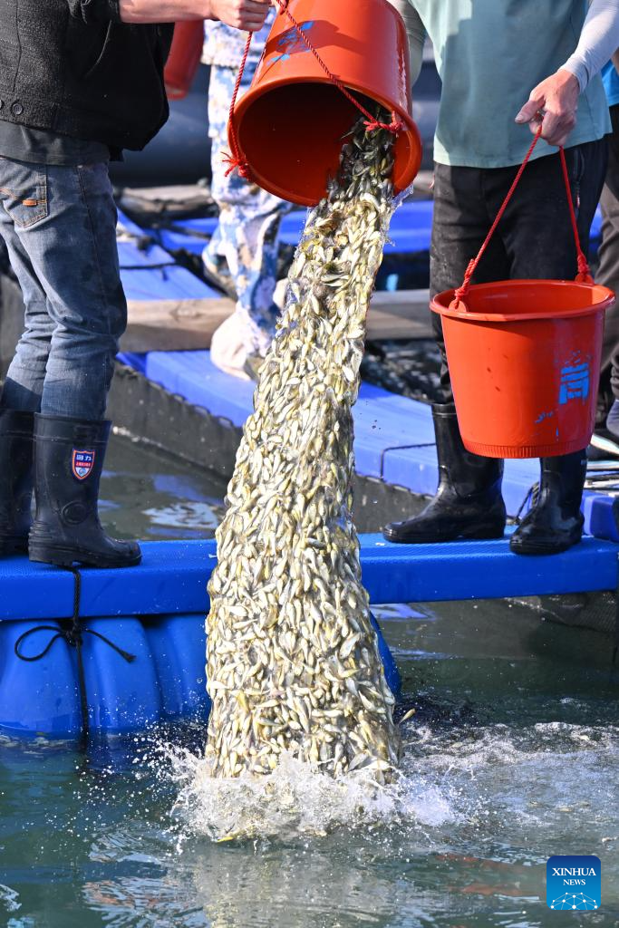Farmers release large yellow croaker fries into fish farming platforms at a mariculture farm in Xiapu County, Ningde, southeast China's Fujian Province, April 25, 2026.