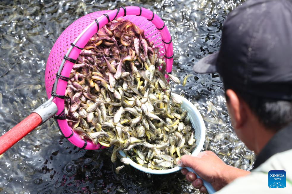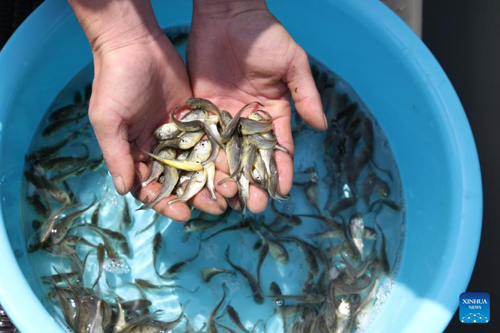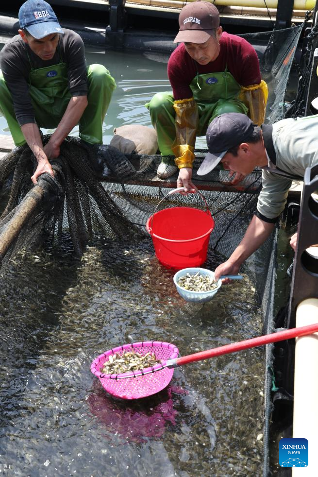 Workers display large yellow croaker fries at a mariculture farm in Ningde, southeast China's Fujian Province, April 25, 2026.