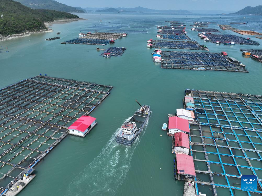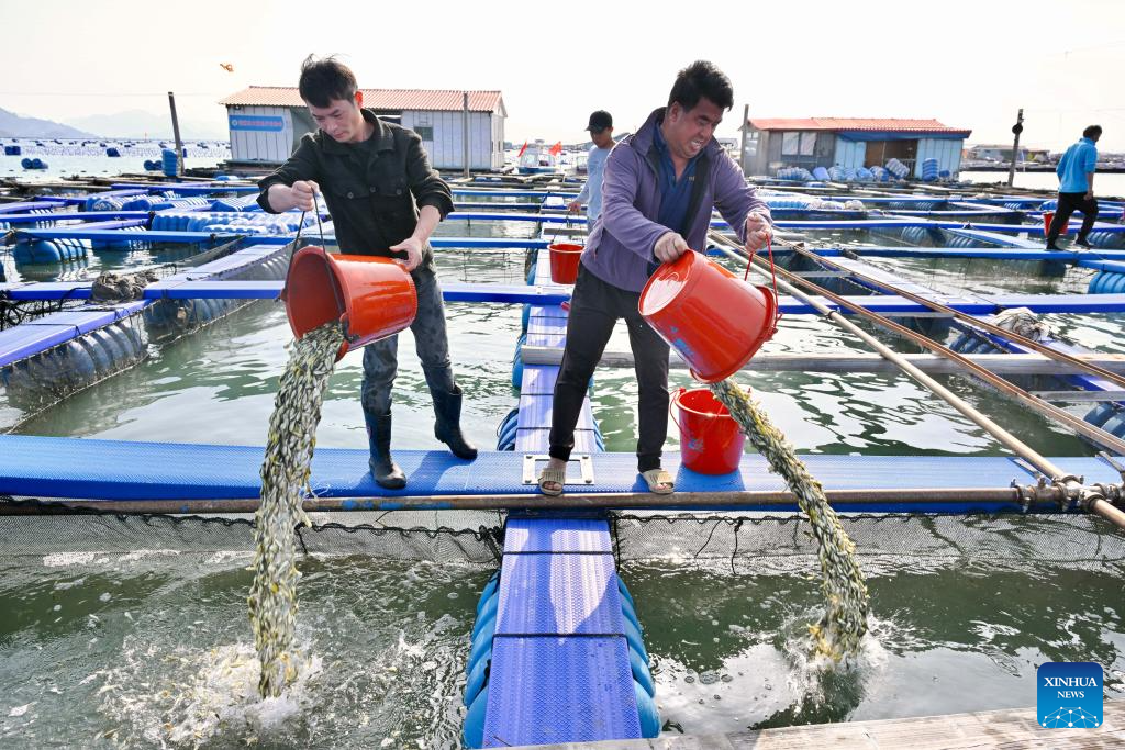 The city's output of large yellow croakers hit 222,440 tonnes in 2025, garnering a combined output value of over 20 billion yuan (about 2.92 billion U.S. dollars) for the entire industrial line here. (Xinhua/Jiang Kehong)