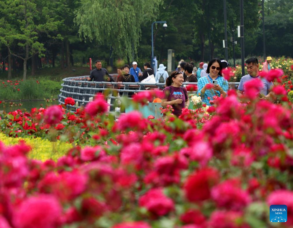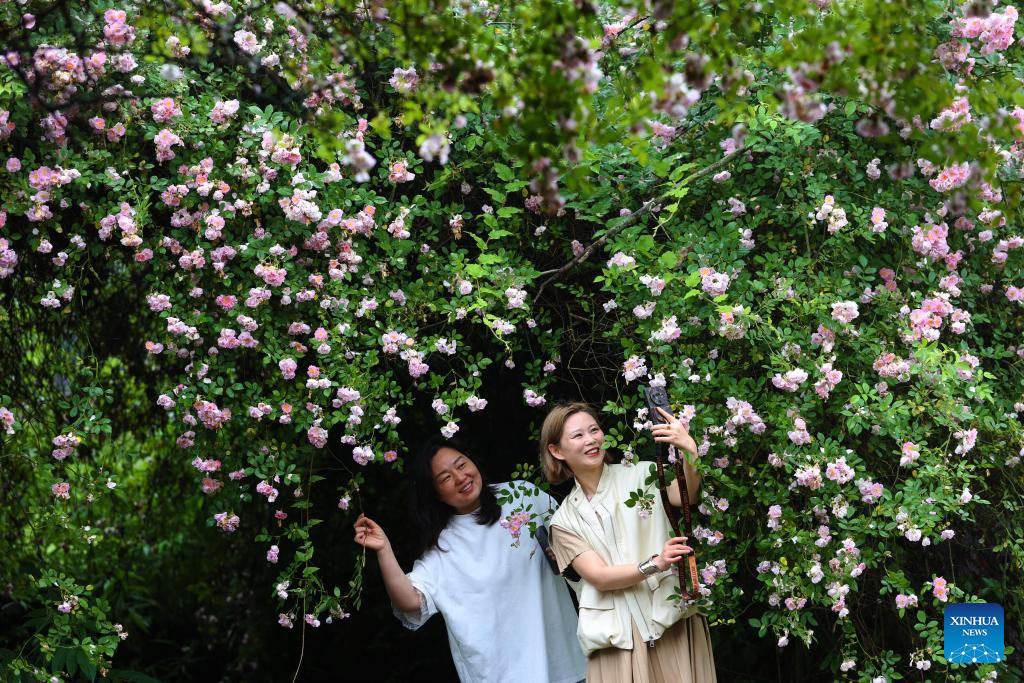 Tourists enjoy the Chinese Rose blossoms in Nanyang City, central China's Henan Province, April 27, 2026. As the May Day holiday approaches, the tourism markets across the country are heating up. (Photo by Gao Song/Xinhua)