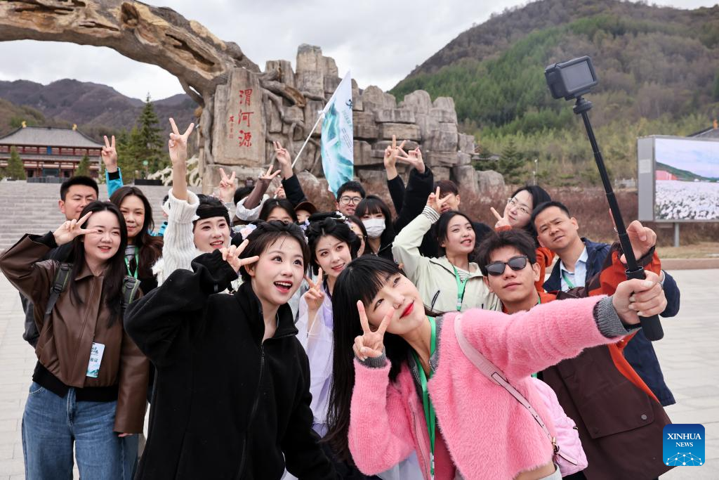 Tourists take selfies at Weiheyuan scenic spot in Dingxi City, northwest China's Gansu Province, April 27, 2026. As the May Day holiday approaches, the tourism markets across the country are heating up. (Photo by Hou Chonghui/Xinhua)