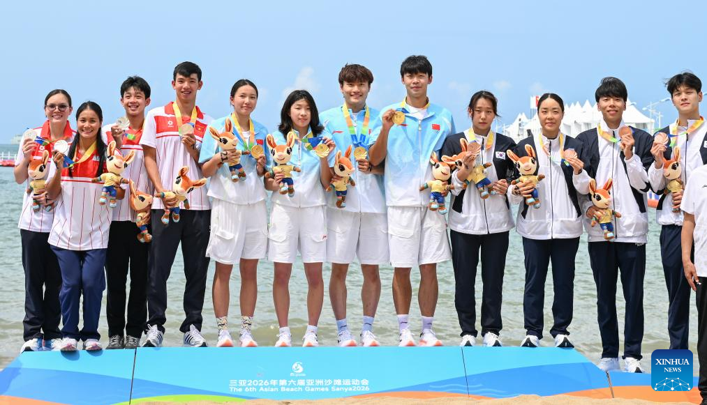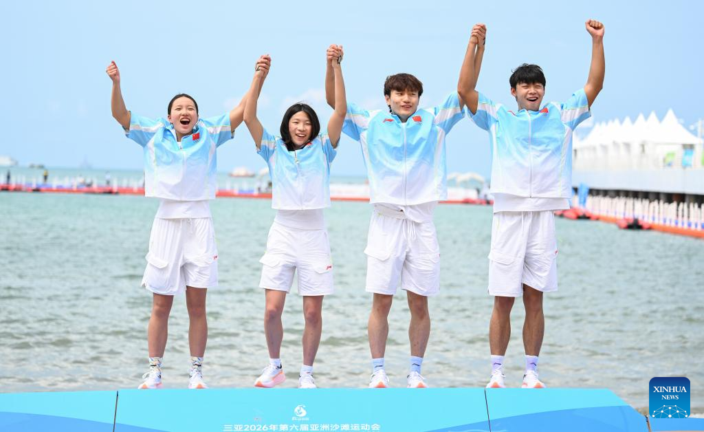 Gold medalist team China poses for photos during the awarding ceremony of the open water swimming mixed 4x1.5km Relay at the 6th Asian Beach Games in Sanya, south China's Hainan Province, April 27, 2026. (Xinhua/Bei He)