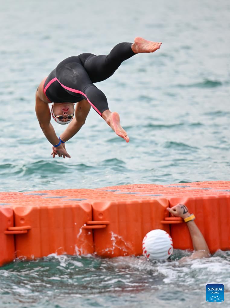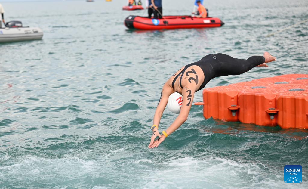 Chen Yijing of team China starts after the exchange during the open water swimming mixed 4x1.5km Relay at the 6th Asian Beach Games in Sanya, south China's Hainan Province, April 27, 2026. (Xinhua/Bei He)