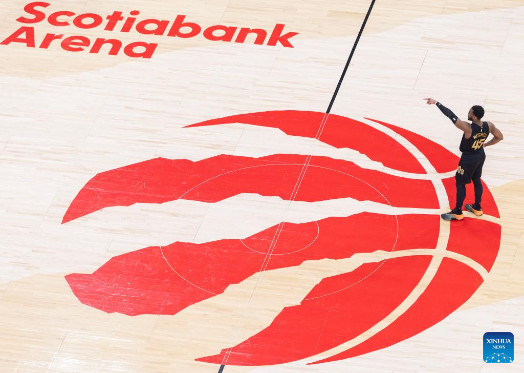Donovan Mitchell of Cleveland Cavaliers directs his teammates during the 2025-2026 NBA first-round playoff series basketball game between Toronto Raptors and Cleveland Cavaliers in Toronto, Canada, on April 26, 2026. (Photo by Zou Zheng/Xinhua)