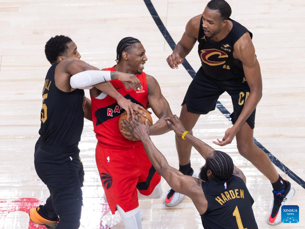 RJ Barrett (C) of Toronto Raptors vies with Donovan Mitchell (L) and James Harden (bottom) of Cleveland Cavaliers during the 2025-2026 NBA first-round playoff series basketball game between Toronto Raptors and Cleveland Cavaliers in Toronto, Canada, on April 26, 2026. (Photo by Zou Zheng/Xinhua)