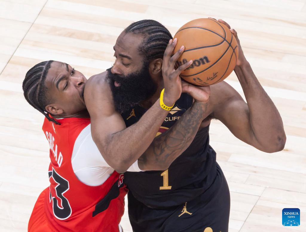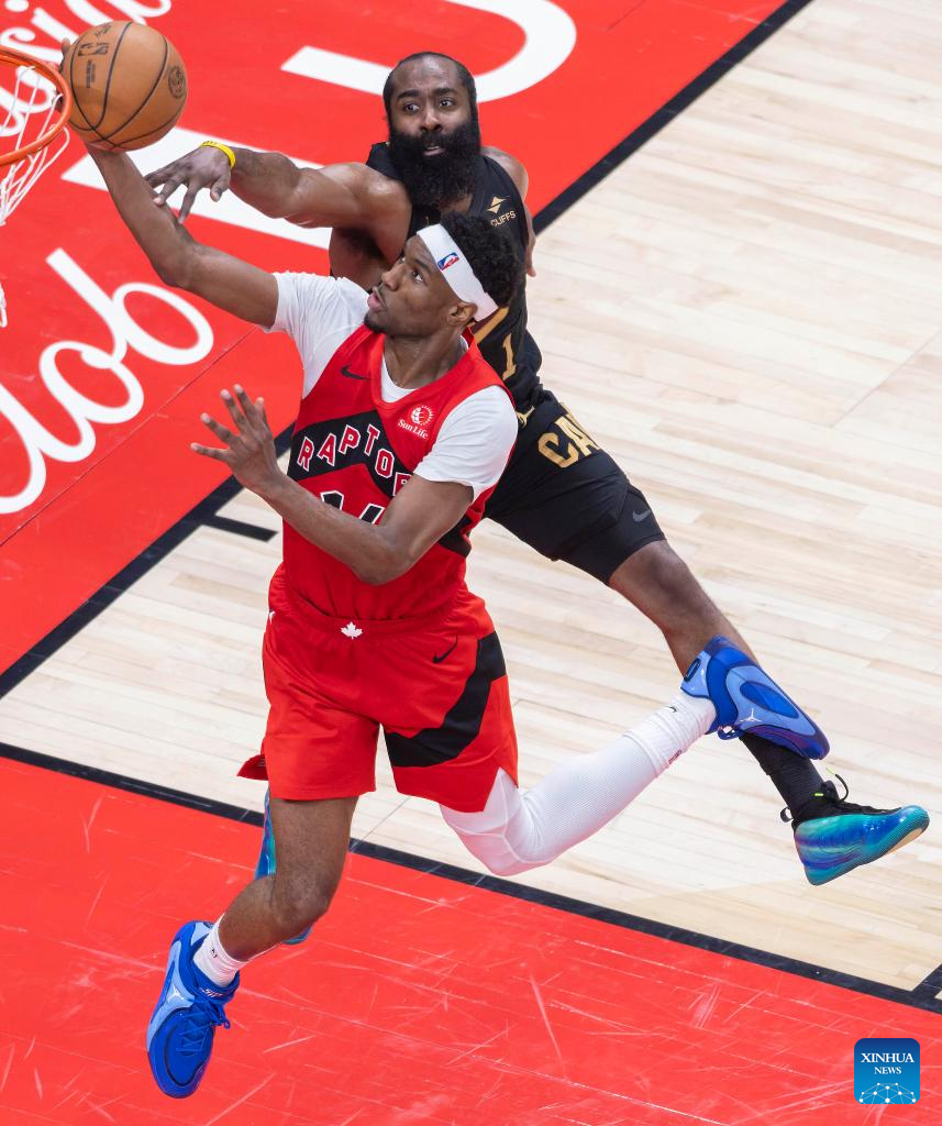 Jamal Shead (L) of Toronto Raptors vies with James Harden of Cleveland Cavaliers during the 2025-2026 NBA first-round playoff series basketball game between Toronto Raptors and Cleveland Cavaliers in Toronto, Canada, on April 26, 2026. (Photo by Zou Zheng/Xinhua)