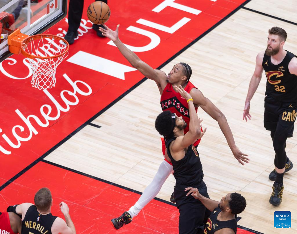 Scottie Barnes (top, C) of Toronto Raptors goes for a layup during the 2025-2026 NBA first-round playoff series basketball game between Toronto Raptors and Cleveland Cavaliers in Toronto, Canada, on April 26, 2026. (Photo by Zou Zheng/Xinhua)