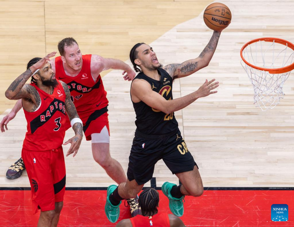 Jaylon Tyson (R) of Cleveland Cavaliers goes up for a layup during the 2025-2026 NBA first-round playoff series basketball game between Toronto Raptors and Cleveland Cavaliers in Toronto, Canada, on April 26, 2026. (Photo by Zou Zheng/Xinhua)