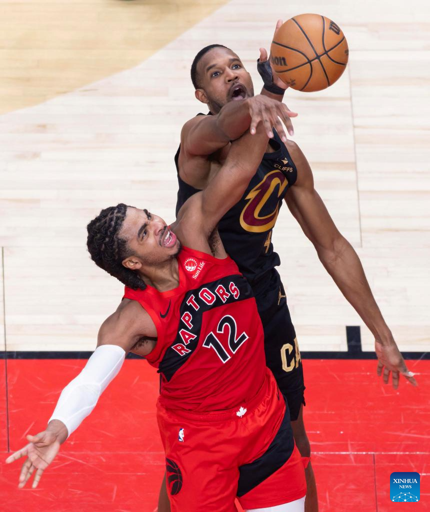 Collin Murray-Boyles (front) of Toronto Raptors fights for a rebound with Evan Mobley of Cleveland Cavaliers during the 2025-2026 NBA first-round playoff series basketball game between Toronto Raptors and Cleveland Cavaliers in Toronto, Canada, on April 26, 2026. (Photo by Zou Zheng/Xinhua)